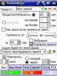 ![]() Описание: Обновление. PocketAlarmMP3 - многофункциональный будильник с плагином экрана "Сегодня" Важно: Категорически не рекомендуется ставить программу на карточку памяти - это проблема всех будильников для КПК. При использовании русского языка, ограничений в незарегистрированной версии нет. Основные возможности: - Неограниченное количество напоминаний. - Установка напоминаний на конкретный день года. - Установка напоминаний на каждый месяц. - Установка напоминаний на каждый день. - Установка напоминаний на дни недели. - Проигрывание MP3, OGG, S3M, MOD. - Проигрывание с карт памяти. - Случайная выборка мелодий из каталогов. - Возможность отложить напоминание. - Нарастание громкости. - Today plug-in. - Проговаривание времени (только в версии с MP3). Что нового : - Изменено: Общие настройки основоной программы и тодэй плагина сохраняются в одном общем файле. - Добавлено: выключение звука с коммандной строки (комманда mute или mute N, где N - количество минут). Цитата Версия: 2.19.3 Категория: Утилиты Совместимость: WM5,6 ******