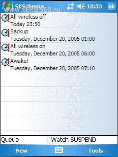 ![]() Описание: Обновление. SKSchema - многофункциональный календарь с возможностью выполнения автоматических действий по таймеру в зависимости от того, запущены ли другие определенные программы. Своего рода продвинутый будильник. Например, можно запрограммировать следующие действия: "запустить создание резервной копии данных каждый вторник в течение января", "установить GPRS соединение, если запущены почтовый клиент или PocketIE" и т.д. Возможности: - Запуск программ, звуковая сигнализация - Напоминания - Отправка SMS в определенное время - Телефонный звонок в определенное время - Включение/выключение КПК по таймеру, софт-ресет - Закрывает определенные программы по таймеру - Дуплицирование событий - Включение телефонного модуля с вводом PIN-кода, а также Bluetooth и WiFi - Эмуляция нажатий стилуса или ввода с клавиатуры - Можно создавать скрипты действий - Отслеживание работающих программ и выполнение действий с ними - Плагин Today для быстрого запуска - История событий - многое другое Цитата Версия: 1.2.10 Категория: Утилиты Совместимость: WM ******