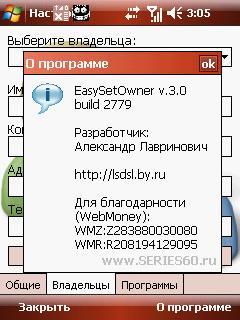 ![]() Описание: Программа предназначена для быстрого и просто изменения данных Владельца (Owner) и автоматического изменения Владельца КПК (Owner) перед запуском других программ. EasySetOwner предназначена для быстрого и просто изменения Владельца (Owner), а так же для автоматического изменения Владельца КПК (Owner) перед запуском других программ. Возможности программы EasySetOwner: - Русский/Английский интерфейс - Возможность добавления иконки в трей - Автоматическая смена владельца после закрытия запущенной программы - Смена через определенное время - Неограниченное количество программ и Владельцев - Изменение любой информации Владельца (имя, почта, адрес и т.д.) - Выбор русского интерфейса. Требуется .NET Compact Framework 1 или 2 Цитата Версия: 3.0Build2779 Категория: Утилиты Совместимость: WM ******