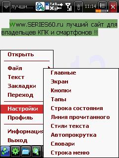 ![]() Описание: Читалка книг и текстов для КПК и смартфонов. * Поворот экрана 90, 180, 270 * Профайлы "День"/"Ночь" (в профайл входят настройки шрифта текста: размер, болд, сглаживание, цвет: фона, текста и строки состояния) - до 8-ми профилей * чтение HTML, FB2 - поддержка стилей текста, изображений, переходов по ссылкам, содержания. * чтение CHM - экспериментальная поддержка. * чтение TXT, RTF, PDB/PRC (PalmDOC, zTXT mode 1), TCR файлов, DOC, DOCX, ODT, SXW, ABW, ZABW - только текст. * чтение из архивов ZIP и GZ. * произвольный выбор кодировки * правильные переносы для 23 языков (шаблоны TeX) * нормальный полноэкранный режим (без верхней строки) * строка состояния (время, батарея, проценты прочитанного и количество страниц). Видимость всей строки состояния настраивается отдельно для полноэкранного режима и для нормального * линейка положения в тексте (снизу, справа или в строке состояния). Видимость настраивается отдельно для полноэкранного режима и для нормального * отображение заряда батареи на линии положения в тексте * кнопки джойстика перестраиваются вместе с поворотом экрана * регулировка межстрочного и межсимвольного интервала * выравнивание по ширине * список последних открытых книг * клеартейп * 2 вида автопрокрутки (волна и плавная) * закладки с навигацией по ним * глобальные закладки с навигацией по ним * настройка аппаратных кнопок, тапов и штрихов по экрану * поиск произвольной текстовой строки без учета количества пробелов и переводов строк между словами + * использование в строке поиска символа "?", который интерпретируется как один любой символ. Поиск регистронечуствителен. * переход по тексту (проценты и страницы) * сохранение цитат * сохранение читаемого файла как TXT, PDB или HTML. * Подсветку экрана можно оставлять включённой * работа со словарями Dict, Lingvo и Slovoed (Pocket PC 2002, Windows Mobile 2003, Windows Mobile 2003 SE, Windows Mobile 5, Windows Mobile 6 Standard, Windows Mobile 6 Classic, Windows Mobile 6 Professional, Phone Edition, WM VGA 480x640, Real VGA, WM 240x240, WM 480x480, MS Smartphone 2002, MS Smartphone 2003, WM Smartphone 2003 SE, WM Smartphone 5, WM Smartphone 240x320). Цитата Версия: 2.3.70911 Категория: Офис Совместимость: WM ******