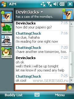 Описание: Обновление. AIM for Windows Mobile - дает возможность использования функций AIM для PC на Вашем мобильном устройстве! При помощи AIM for Windows Mobile Вы можете общаться когда угодно, где угодно и как угодно. Обновляйте свой AIM статус и информацию на ходу. Меняйте стиль общения, управляйте контакт-листом и т. д. AIM Windows Mobile выполняет многие ключевые функции и имеет такой же внешний вид, что и клиент для десктопа. При помощи программы можно подключаться и к ICQ. Цитата Версия: 1.1.24.1 Категория: Интернет пейджеры и VoIP Совместимость: WM5,6 ******