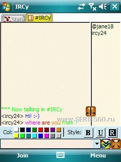 Описание: Обновление. mIRCy - клиент IRC, специально адаптированный для работы на бесклавиатурных устройствах. Возможности mIRCy: - "Любимые" фразы - Самообучающася система автоматического продолжения набираемых слов - Англоязычная БД для этой системы на 100 тыс. слов - Настраиваемые цветовые схемы и фоновые рисунки - Звуки - Списки notify и ignore - Редактируемая база IRC серверов - Дневник сессий - Контекстные меню - Регулируемые размеры панелей с чатом и списка пользователей - Полноэкранный режим - Работа с буфером обмена Замена на версию 1.55 Цитата Версия: 1.55 Категория: Интернет пейджеры и VoIP Совместимость: WM ******