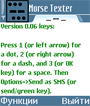 MorseTexte ![]() Описание: Учим азбуку морзе. Цитата Версия: 1.0 Совместимость: Symbian 7.0|8.0 ******